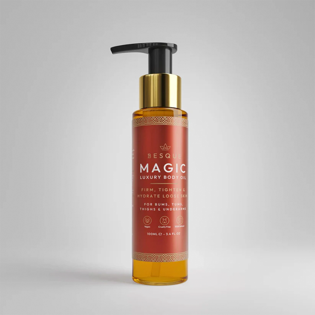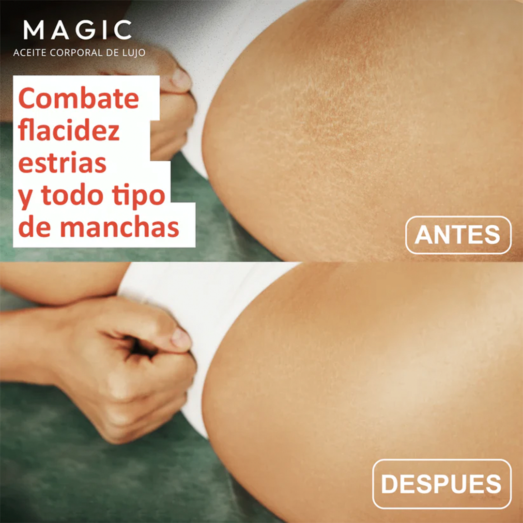 ¡Con nuestro Aceite Corporal Magic Besque™ puedes devolverle a tu piel la firmeza, suavidad y luminosidad natural que merece! Su fórmula única con 7 aceites naturales prensados en frío actúa profundamente para rellenar, tensar, reafirmar e hidratar la piel desde la primera aplicación.